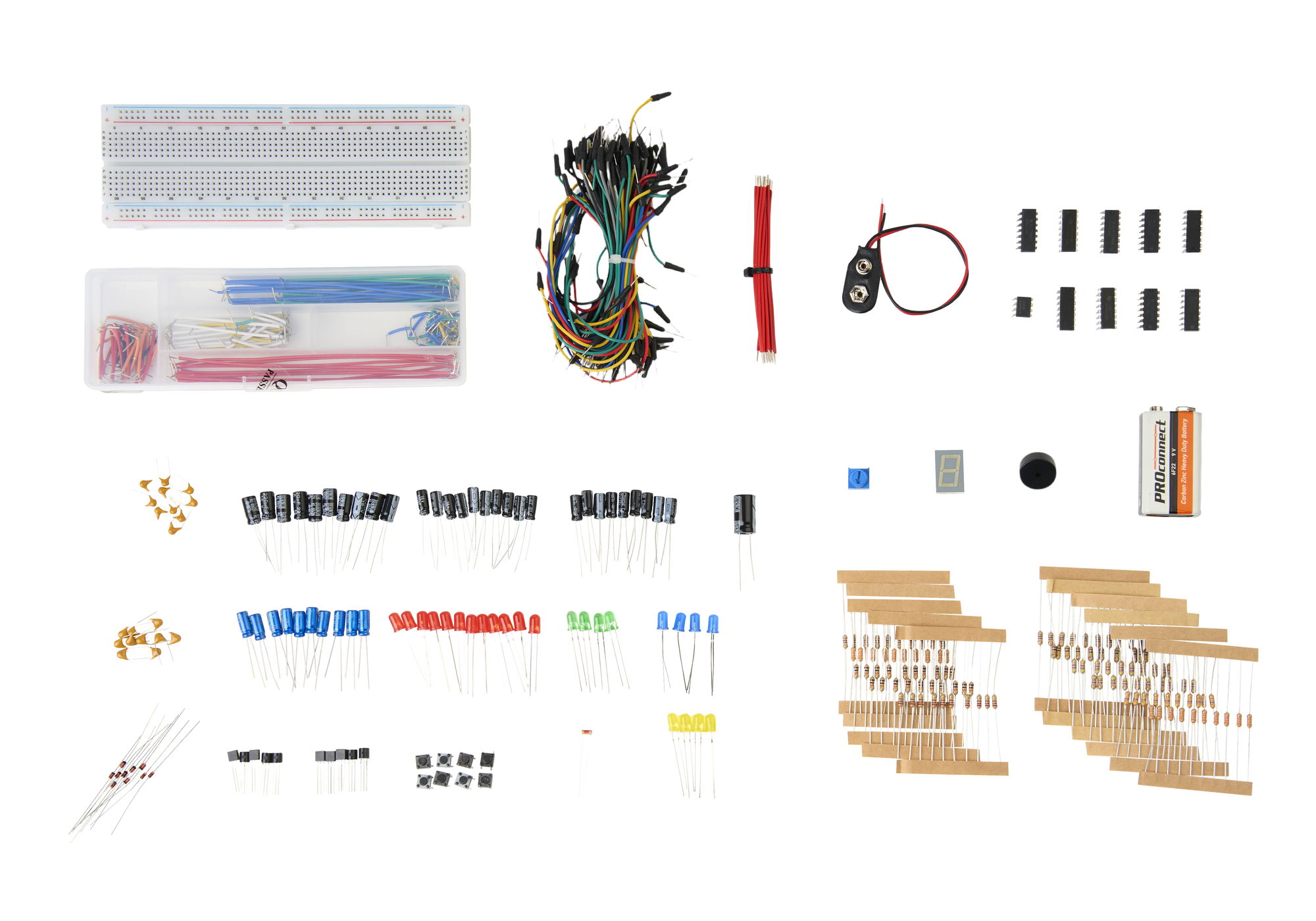 В набор входит комплект настоящих электронных компонентов и структурированный учебный план на 96 академических часов с подробными методическими материалами (в электронном виде).