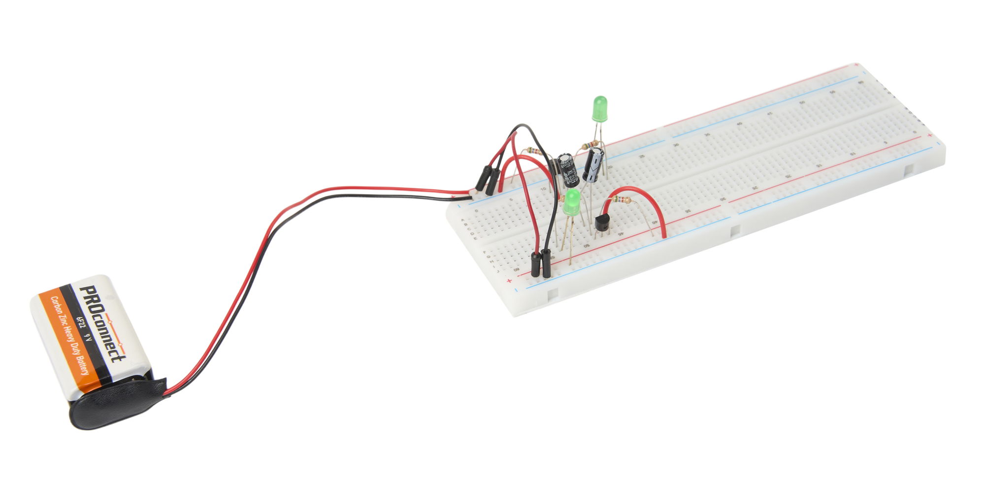 Схемы питаются от 9-вольтовой батарейки «Крона», которая подключается специальным проводом к макетке. Всё необходимое уже в комплекте.